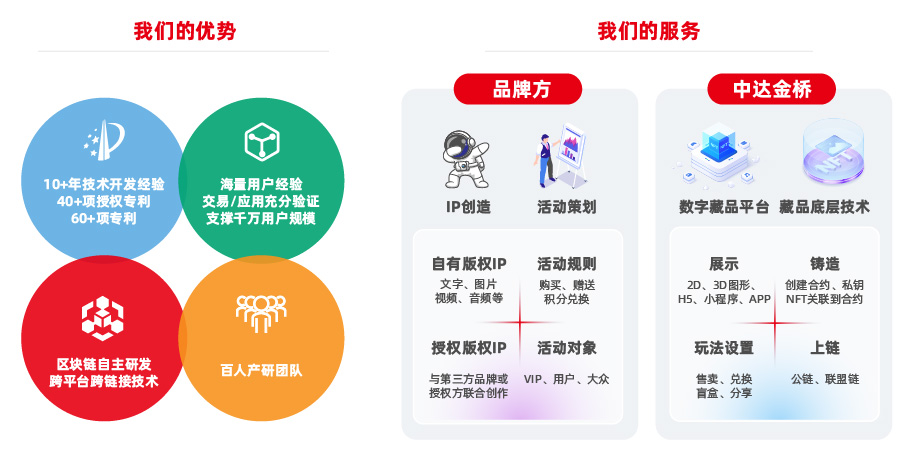中达金桥数字藏品(NFT)服务提供发行、展示、获取、上链一站式解决方案,搭建抢购、盲盒、兑换、抽奖、会员、合成......等功能,为品牌快速打造营销事件和热点,以更优惠的价格,更安全的形式,让营销更成功!